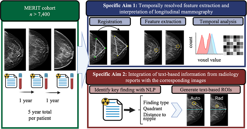 To address this unmet need, we aim to develop computational approaches for longitudinal mammography registration, interpretation, and automatic image labeling using text-based radiology reports to enable efficient and comprehensive imaging data analysis.